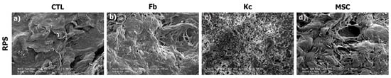 Representative SEM micrographs of Fb, Kc, and MSC acquired after 24 h of culture on RPS are shown in Figure 3. SEM analysis shows the surface structure of RPS (Figure 3a), and the presence of well-adhered Fb, Kc, and MSC (Figure 3b–d) on the RPS surface. These results support the observations in the viability assays, corroborating that RPS is a good scaffold for the growth of skin and MSC cells to produce appropriate cellular constructs. As it is shown in the calcein/EthD-1 results (Figure 2), the morphology of the Fb on RPS is the expected spiculated morphology of adhered fibroblasts while Kc on RPS also show their characteristic adhered cells polygonal morphology. These morphologies are also corroborated by SEM images (Figure 3). This data shows that cells remain viable and maintain their characteristic morphologies of well-adhered cells when cultured on RPS.
