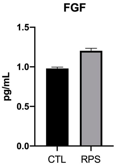 Additionally, Kc were seeded on RPS and culture for 24 h without FBS to analyze the fibroblast growth factor (FGF) release; Kc seeded on a tissue culture plate were used as a control (CTL). FGF is an essential factor that not only induces Kc proliferation but also stimulates the ECM synthesis in the skin, thus enhancing wound healing [21]. Our results showed that FGF expression from Kc cultured on RPS do not show significant differences in comparison to the cells seeded over cell culture dishes (Figure 4).