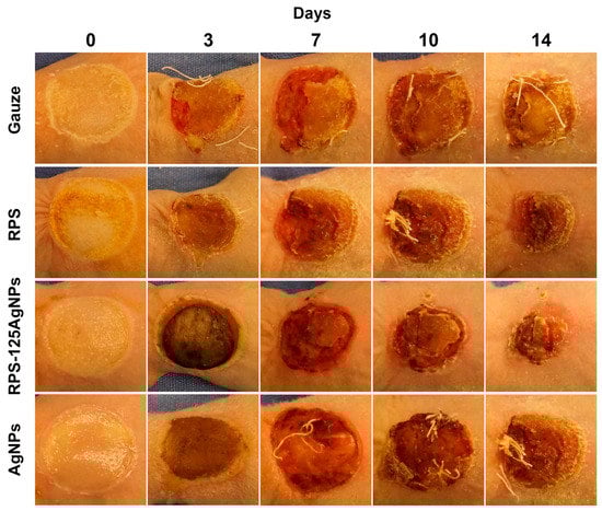 Macroscopic aspect of burn injury shows a better reduction with RPS-AgNPs125 treatment. After 14 days of surgery, treatments with RPS and RPS-AgNPs125 show a greater reduction in the area affected by the burn. The pictures were taken at 0, 3, 7, 10, and 14 days after burn induction to visualize the progression of healing. The photographs (n = 5) have the same resolution (300 dpi) and capture distance (30 cm). The Photoshop software (CS6) was used for standardization for equal cuts of 3.5 × 3.5 cm for each photograph.