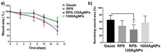 The analysis of the burn area reduction was performed on days 0, 3, 7, 10, and 14 after burn induction, revealing a uniform trend in wound reduction for each one of the treatments. Similar behavior was observed in all treatments initially (day 3), while from day 7 and onward, RPS and RPS-AgNPs125 started showing a better trend for wound healing. In contrast, the treatment with AgNPs in suspension followed the same trend as the control (gauze) (Figure 6a). By day 14, marked differences were observed, with RPS and RPS-AgNPs125 treatments demonstrating a superior wound closure. The RPS-AgNPs125 treatment presented significant differences (p < 0.05) compared to the control (gauze), leaving a smaller remaining wound area in the burn zone (Figure 6b).