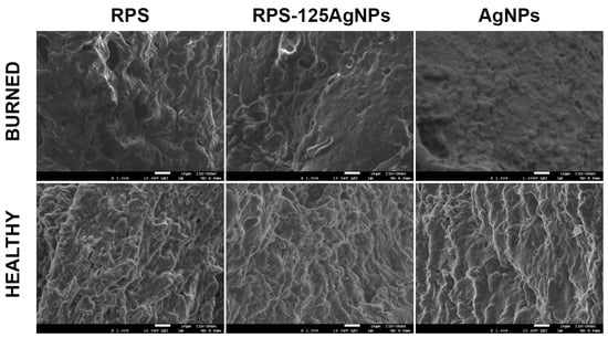 The treatment with RPS-AgNPs125 or AgNPs in suspension at 1000 ppm do not promote silver bioaccumulation in the burned area. The RPS, RPS-AgNPs125, and AgNPs samples were studied by EDS and SEM to characterize its elemental composition, morphology, and AgNPs surface distribution. The results show that there is no bioaccumulation of silver in the burn or healthy skin tissue. The analyses were acquired in a scanning electron microscope JEOL 7600 at 10 kV in secondary and backscattered electrons modes.