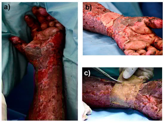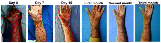 One square centimeter of skin from the patient was used to obtain Fb and Kc, and the medium used to transport the skin sample was sent to be analyzed by the infectiology laboratory. At a clean room, the cells were isolated from the skin biopsy and expanded over two weeks, Fb were used at passage 2 and Kc at primary culture. An autologous cellular construct of 10 cm × 10 cm was developed by seeding on RPS, 30,000 Fb and 30,000 Kc per square centimeter of RPS (Figure S5a). In total, 1 cm2 of the autologous cellular construct was used to analyze the cell viability on the RPS using the calcein/EthD-1 assay that showed that most of the cells were viable at the time of the autologous cellular construct implantation (Figure S5b). Right before autologous cellular construct implantation, an RPS-AgNPs125 cover was developed as previously described [14] by impregnating a 10 cm × 10 cm RPS sample with AgNPs 125 ppm solution (Figure S5a). At the time of the implantation surgery the autologous cellular construct was washed with saline solution before its application in a second-degree burn. The construct was applied next to a zone previously treated with an autograft (Figure 8) and over the construct and the RPS-AgNPs125 was applied. Then, the patient was covered with gauze. The patient was uncovered 7 days later and photographs were taken (Figure 9). Following of the patient progress was performed at 15 days, and 1, 2, and 3 months after construct implantation.