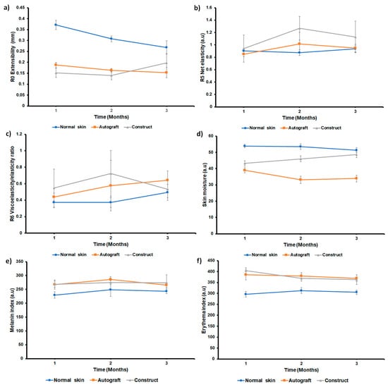 Skin moisture values were lower in the autograft-treated and construct-treated areas than in the normal skin. However, the construct-treated area showed an increase in skin moisture values in the function of time; after 3 months, the values were closer to normal skin, whereas the autograft-treated area showed lower values (Figure 10d). The areas treated with the autograft and the construct showed higher melanin values than normal skin at 1 and 2 months. However, at three months the values were similar to normal skin (Figure 10e). The erythema index was similar in areas treated with autograft or construct. Both areas show a decrease in the erythema index as a function of time. However, at 1, 2, and 3 months after injury, the erythema values in the treated regions were higher than in normal skin (Figure 10f).