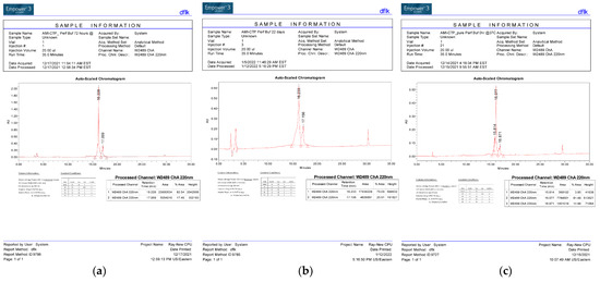 HPLC Tracing of the CTP–amio conjugate immediately upon synthesis and purification (a) after 72 h of incubation (b) and after 22 days of incubation (c) at 37 °C.