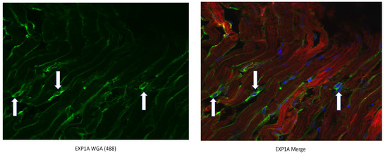 CTP-Cy5.5 transduces rat cardiomyocytes in a cardiomyocyte-specific manner. Myofibroblasts are stained green with WGA-488 (white arrows) and show no co-localization with the CTP-Cy5.5 (red) that is taken up exclusively by cardiomyocytes. Nuclei stained blue (DAPI).