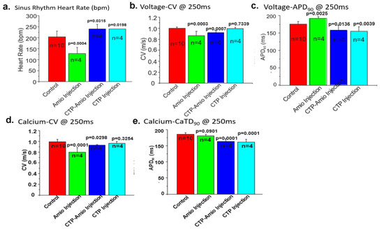 Comparison of the heart rate (a), voltage conduction velocities (b), action potential duration (c), calcium conduction velocities (d), and CaT (e) between the various treatment groups. All p-values are two-tailed unpaired t-tests between each treatment group and the controls. (Panel (b) is reproduced by permission from Frontiers in Chemistry [32]).