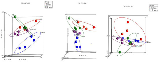 Principal component analysis showing reasonable clustering within groups and separation between different treatment groups.