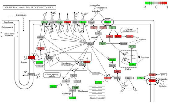 Differentially expressed genes in CTP-treated guinea pig hearts compared with control hearts. The β2-adrenergic receptor is significantly downregulated, whereas the α-adrenergic receptor and the calcium-handling genes (DHPR and SERCA2a) are significantly upregulated (all circled in black).