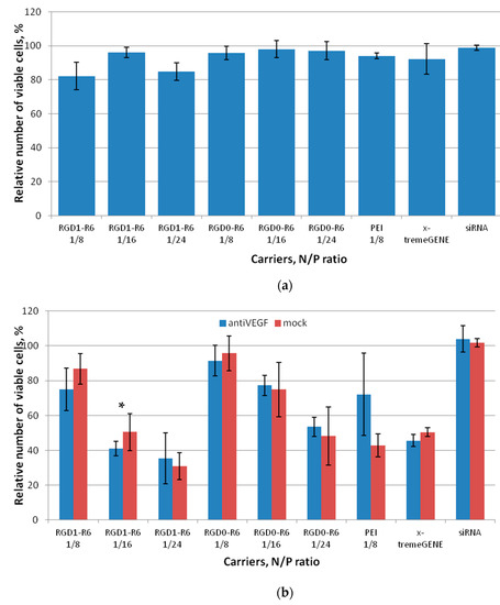 A serious adverse effect of in application of nanoparticles as delivery systems is their cytotoxicity due to the destabilization of membranes and processes through the interaction with extra- and intracellular macromolecules [35]. Herein, we studied cytotoxic properties of siRNA complexes formed at N/P ratios 8/1, 16/1, and 24/1 in cancer cell line MDA-MB 231 and endothelial cell line EA.hy926. Both cell lines express αvβ3 integrins and were chosen for in vitro experiments [36,37]. We demonstrated that RGD1-R6 and RGD0-R6-siRNA complexes do not affect growth of MDA-MB 231, and no difference was found with toxic level of control PEI and x-tremeGENE siRNA complexes (Figure 3a).