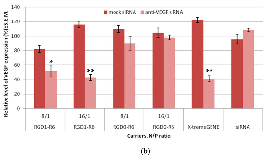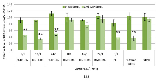 As shown in Figure 4a, the mock siRNA-bearing complexes cannot downregulate GFP gene expression, which is in sharp contrast with high silencing efficiency of anti-GFP siRNA complexes. This fact undoubtedly confirms that the suppression of GFP gene expression is achieved by means of RNAi but not from the innate complex toxicity. Cell transfection with RGD1-R6/anti-GFP siRNA complexes formed at N/P ratios of 8/1, 16/1, and 24/1 resulted in a decrease in GFP expression to 46.7%, 34.3%, and 50.9% respectively, whereas corresponding RGD0-R6/anti-GFP siRNA complexes downregulated GFP expression only to 93.2%, 76.6%, and 94.4%, respectively. In our opinion, this finding confirms αvβ3-integrin-mediated internalization of RGD1-R6-siRNA complexes to MDA-MB-231 cells and efficient RNAi-mediated GFP gene expression silencing. The silencing efficiency of RGD1-R6-siRNA complexes was comparable with the level of the positive controls. In addition, the transfection was repeated in the presence of fetal bovine serum (FBS) in medium. We found that the presence of FBS negatively influences the transfection efficiency; however, the positive effect of iRGD modification was retained (Figure S1). No decrease in GFP expression was demonstrated after RGD0-R6-mediated delivery of anti-GFP siRNA. However, RGD1-R6/anti-GFP siRNA complexes downregulated GFP expression in the presence of FBS to 70.9%, 70.5%, and 78.6%, respectively. Significant difference (p < 0.05) was found with corresponding ligand-free complexes and mock siRNA-bearing complexes. The obtained results are in accordance with a previous study on RGD1-R6-DNA complexes [26].