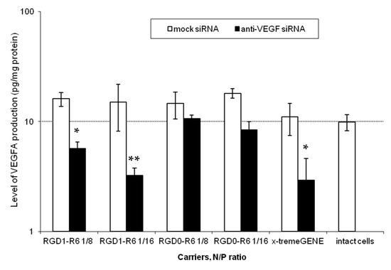 Further, to confirm results of successful VEGFA silencing in vitro, we accessed the level of secreted VEGFA protein in the EA.Hy926 cell line. Similar siRNA complexes were taken to the experiment. Results of the quantitative determination of VEGFA protein secretion by the endothelial cells are shown in Figure 5. It can be seen that VEGFA protein is significantly decreased after the treatment with RGD1-R6/anti-VEGFA siRNA complexes, but not if RGD0-R6 carrier or mock siRNA were used. The obtained findings further confirm the conclusions of efficiency and specificity of RGD1-R6-mediated siRNA delivery.
