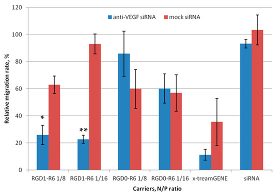 Scratch assays were conducted (Figure 6 and Figure S2) to evaluate the impact of anti-VEGF siRNA complexes on E.A.Hy926 cell migration. The cells were transfected with RGD1-R6 and RGD0-R6 complexes and loaded with anti-VEGF siRNA or mock siRNA. As controls, x-tremeGENE/siRNA complexes were employed. Just after transfection, we created a standard scratch on the cell monolayer and recorded the number of cells that migrated into the area without cells. The percentage of intact cells that migrated was considered as 100%, while the negative control was established using the relative number of migrated cells after naked siRNA transfection. To prove the specificity of siRNA action and to prevent any effects of the carriers’ inherent toxicity, a comparison was made between the alterations in cell migration following the delivery of anti-VEGF siRNA and mock siRNA. Visual appearance of migrated EA.Hy926 cells after transfection is shown in Figure S2.