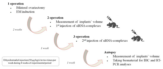 To assess the efficiency of RGD1-R6/siRNA complexes in EM gene therapy, we established an animal model in Wistar rats via the autotransplantation of two fragments from the uterus horn subcutaneously. The subcutaneous implantation technique is more rewarding than intraperitoneal implantation because it allows for easy observation of endometriotic lesions that can be treated in situ [30]. In order to standardize the estrogen background among all animals, an ovariectomy was performed to synchronize the estrous cycle in the rat model. Considering that EM is a disease that depends on estrogen level, we supplemented ovariectomized animals with ethinylestradiol for two weeks prior to injecting siRNA/peptide polyplexes into the lesions. The supplementation continued for two weeks after the injection (Figure 7).
