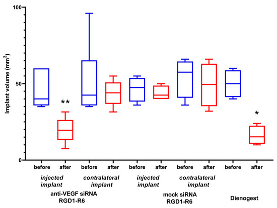 Volume of endometriotic implants before and after the treatment with the siRNA complexes. * p < 0.05, ** p < 0.01 when compared with untreated implants. The data are shown as the median ± min/max value of n = 4–6 animals per experimental group.
