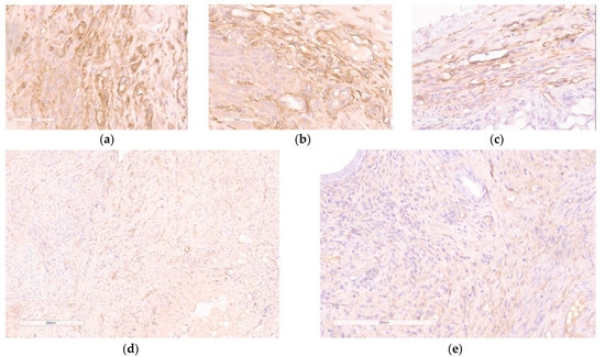 Immunohistochemical detection of CD34 expression in paraffin sections of endometrial implants after the treatment with the siRNA complexes: (a) intact contralateral implant; (b) implant injected with saline; (c) implant injected with RGD1-R6/mock siRNA complexes (magnification 400×, bar represents 50 µm); (d) implant injected with RGD1-R6/anti-VEGF siRNA complexes; (e) implant of rat treated with Dienogest (magnification 200×, bar represents 200 µm).