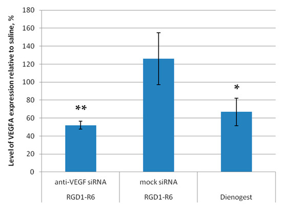 Further, evaluation of efficiency of the RNAi-based therapy involved analyzing the target gene expression in endometrial implants before and after anti-VEGF siRNA delivery. The VEGFA gene expression in saline-injected implants was taken as a baseline (100%). Our findings demonstrate that administering anti-VEGFA siRNA using the RGD1-R6 carrier resulted in a significant decrease in VEGFA gene expression levels, up to 52.1 ± 4.5% compared to baseline values (Figure 10). As a result, there was a noticeable two-fold decrease (p > 0.01) in the expression of VEGFA transcripts in the treated lesions when compared to the control saline injected implants. Worth noting is that administration of complexes containing mock siRNA did not lead to a decrease in VEGFA expression. The expression levels of VEGFA were elevated above the baseline values and recorded at 126.1 ± 28.8%. Thus, the quantitative gene expression analysis revealed a specific RNAi-mediated down-regulation of VEGFA gene expression. The use of Dienogest led to a substantial decrease in the expression of the VEGFA gene, reaching up to 66.8 ± 15.2% as shown in Figure 9. Previously, it was demonstrated that Dienogest exhibits anti-angiogenic activity; however, the mechanism of its action is not clarified so far [49]. In different studies on EM animal models, contradictory data on Dienogest-mediated VEGF gene expression down-regulation were presented [50,51,52]. Herein, we show that one month of Dienogest treatment can decrease VEGFA gene expression by one third from baseline level, whereas RNAi-based therapy has a slightly better effect.