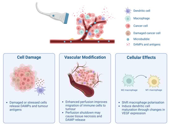 Schematic overview of how ultrasound-mediated cavitation may affect different parts of the tumour. It has been proposed that cavitation can cause cell damage and stress, which consequently releases Damage-associated molecular patterns (DAMPs) and tumour antigens. Moreover, it has been suggested that depending on the type, duration, and intensity of cavitation, tumour perfusion can either be increased [33] or blood flow can be shut down [34,35]. Either situation may lead to increased anti-tumour immunity as a result of improved migration and infiltration of immune effector molecules and cells or due to increased tissue necrosis and Damage-associated molecular pattern (DAMP) release. Lastly, ultrasound-mediated cavitation has been shown to transform M2 macrophages to M1 macrophages [36] and additionally induce dendritic cell maturation by altering expression of Vascular endothelial growth factor (VEGF) [37]. Figure created with BioRender.