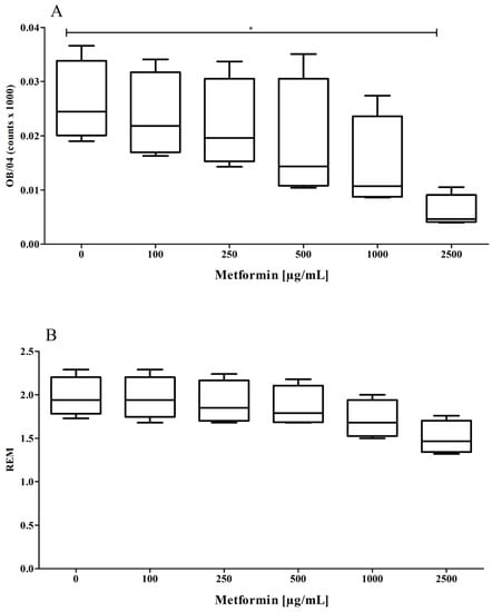 Cu2+-induced oxidation of the protein part of the LDL particle. Metformin significantly (p = 0.0031, ANOVA) suppressed the formation of oxidation-specific epitopes on the LDL particle (A) after 6 h incubation time. REM values were numerically decreased albeit not reaching statistical significance ((B), p = 0.069). Data represent mean ± SD from four separate measurements. * p ≤ 0.05.
