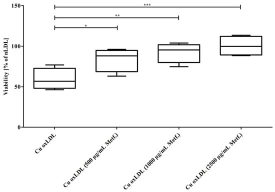 Metformin during LDL oxidation mitigated the cytotoxic effects of oxLDL. nLDL was preincubated with 0, 500, 1000, or 2500 µg/mL of metformin and then oxidized with CuCl2 until LPO levels reached 100 nmol/mg of LDL protein. Subsequently, the EAhy.926 cells were incubated with the thus obtained oxLDLs (0.4 mg/mL). Cell viability concentration-dependently increased with oxLDLs formed under increasing levels of metformin. Data represent mean ± SD of four separate measurements. * p ≤ 0.05, ** p ≤ 0.01, *** p ≤ 0.001.