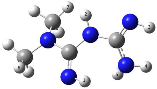The results of our calculations are supported by several studies dealing with the capability of metformin to react with ROS. Bonnefont-Rousselot et al. have shown that metformin is able to scavenge hydroxyl radicals but not superoxide radicals and hydrogen peroxide [,]. Collin et al. have shown that metformin reacts with hydroxyl radicals under the formation of four oxidation end-products, e.g., the hydroperoxide of metformin or a covalent dimer of metformin [].