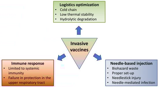 Vaccine administration methods can be categorized into invasive, minimally invasive, and non-invasive administration, and conventional vaccine administration primarily relies on invasive administration (e.g., intramuscular, subcutaneous, and intradermal) to maximize vaccine bioavailability through site-specific administration. However, such methods of administration have inherent limitations that compromise their utility (Figure 1). Firstly, liquid formulations used in these methods necessitate a cold chain system, making them susceptible to accidental freezing [,]. Certain temperature ranges can drastically reduce the shelf life of vaccines, with examples including the Pfizer-BioNTech (<6 months at −60 to −90 °C and <2 h at 8–30 °C), ModernaTX (<30 days at 2–8 °C and <12 h at 8–25 °C), and Oxford-AstraZeneca (<6 months at 2–8 °C and <2 h at 8–25 °C) SARS-CoV-2 vaccines []. mRNA vaccines are especially easily affected by changes in liquid formulation (i.e., pH, buffers, temperature, amount of oxygen, etc.), which can lead to the degradation of the vaccines through hydrolysis [].