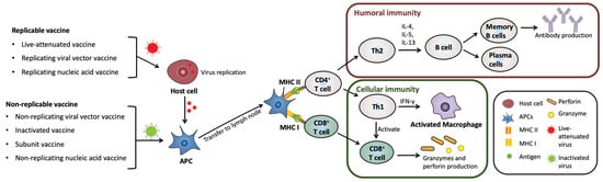 Since Louis Pasteur’s groundbreaking conceptualization of vaccination, significant advancements have been made in the development of vaccines in terms of their stability and effectiveness []. To date, seven types of vaccines have been developed: live attenuated, inactivated, replicating viral vector, non-replicating viral vector, DNA, RNA, and subunit vaccines. Each vaccine type leverages distinct immunological mechanisms to trigger adaptive immunity upon administration []. Replicable vaccines, including live attenuated vaccines, replicating viral vector vaccines, and replicating nucleic acid vaccines, enter host cells and replicate virulent molecules, which are subsequently taken up by dendritic cells (DCs). In contrast, non-replicable vaccines, such as non-replicating viral vector vaccines, inactivated vaccines, subunit vaccines, and non-replicating nucleic acid vaccines, are directly phagocytosed by DCs [,]. Replicable vaccines are characterized by prolonged immunogenicity compared to non-replicable vaccines due to their ability to replicate. Whole-particle-based vaccines, such as live attenuated and inactivated vaccines, exhibit the highest immunogenicity compared to other types of vaccines due to the presence of immunostimulant molecules within the particles, effectively inducing immunity similar to that of natural infections [,,,,].