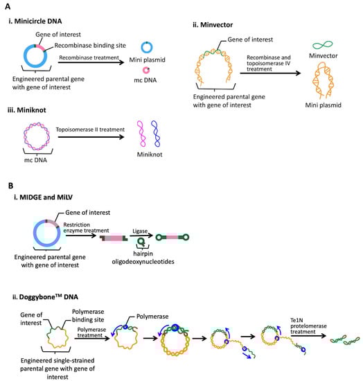 Currently, two types of DNA vaccines have been developed: circular vaccines (i.e., minicircle, minivector, miniknot, etc.) and linear vaccines, including immunological-defined gene expression (MIDGE), Micro-Linear vector (MiLV), and DoggyboneTM DNA, which are covalently closed (Figure 3). In the case of minicircle (mc) DNA, recombinases are used to separate a plasmid into an mc DNA molecule (containing the genes of interest) and a miniplasmid (containing the bacterial plasmid backbone). This is followed by degradation of the miniplasmid using restriction enzymes [,]. Studies have shown that mc DNA exhibits a significantly higher transfection rate (68%) compared to the parental plasmid (34%) due to its smaller size (3.8 kbp) in contrast to the parental plasmid (8.2 kbp) []. Minivector DNA is a single-stranded and supercoiled structure of less than 2 kbp in size and less than 4 nm in diameter, and is produced through treatments with recombinases (site-specific cleavage) and topoisomerase IV (separation of the daughter DNA) [,]. The size difference between the miniplasmid and minivector contributes to the ease of the separation process, contributing to the high purity of the minivector DNA []. A miniknot is an mc DNA strand treated with topoisomerase II, which enhances its physical strength to prevent linearization during processing. However, the use of miniknots is still in a hypothetical stage.