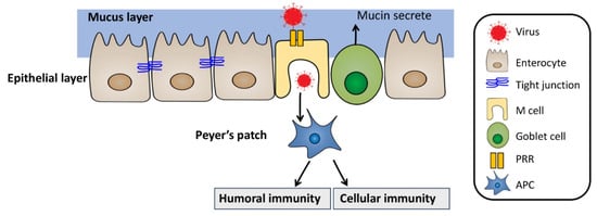 Oral vaccination has demonstrated its effectiveness in stimulating both mucosal and systemic immune responses by inducing the production of IgA and IgG antibodies []. The immune responses are mainly initiated in the intestine, where the majority of vaccine uptake and drug absorption occur [,]. The intestine consists of several layers, including the mucus layer, water layer, epithelial layer, basement membrane/Peyer’s patches, and lymph nodes []. The epithelial layer is composed of enterocytes, goblet cells, and microfold cells (M cells), which are joined together by tight junctions that prevent the movement of molecules through paracellular and transcellular routes [,,]. Enterocytes, the most abundant cells in the intestinal epithelium (constituting up to 80% of the local cell population), transport antibodies through transcytosis using the neonatal Fc receptor (FcRn) and form antibody–antigen complexes [,]. Goblet cells produce mucin, the main component of the mucus layer, which provides physical protection against the uptake of pathogenic particles []. M cells play a crucial role in initiating immune responses by phagocytosing large particles and endocytosing small particles through specialized receptors like pattern recognition receptors (PRRs) [,]. Pathogen particles phagocytosed by M cells are subsequently taken up by dendritic cells (DC cells) in Peyer’s patches, leading to the activation of cellular and humoral immunity through the differentiation of T cells and B cells (Figure 4) [].