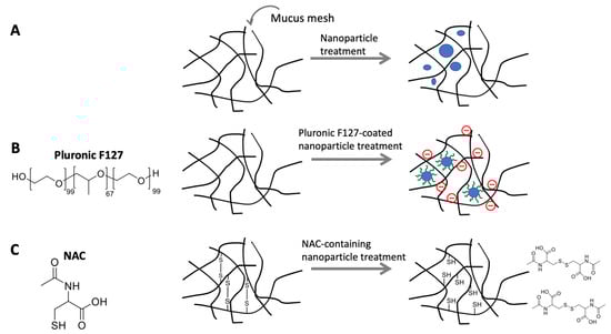 Non-reactive nanoparticles can be created by functionalizing them with poly(ethylene glycol) (PEG) and Pluronic F127 to enhance their permeability. In particular, the development of low-molecular-weight PEG coating was inspired by the penetration of viruses through human mucus, reducing hydrophobic and electrostatic interactions between nanoparticles and the mucus layer through a hydrophilic and neutral-charged coating []. PEG has been successfully coupled with various types of nanoparticles (e.g., PLGA, poly sebacic acid (PSA), polyethylenimine (PEI), poly-l-lysine (PLL)) and has demonstrated efficient penetration []. Pluronic F127, a triblock copolymer surfactant with alternating hydrophilic and hydrophobic structures, exhibits a unique arrangement that minimizes its interaction with the mucus layer. Furthermore, its neutral charge allows it to avoid interactions with negatively charged mucins []. It has been reported that Pluronic F127-coated particles show an 80-fold increase in penetration rate compared to uncoated particles [].