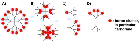 Different locations of boron clusters in dendritic compounds: surface of dendrimers (A), branches of dendrimers (B), core or surface of dendrons (C), and part of the surface of Janus dendrimers (D).