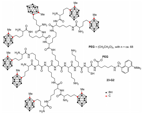 A second generation poly-L-lysine dendron, obtained by solid state synthesis, was reacted in acylation reactions with (S)-5-(2-methyl)-l,2-dicarba-closo-dodecaborane(12)-1-yl)-2-amino pentanoic acid. The resulting dendron 23-G2 was isolated in 81% yield after cleavage and deprotection from the resin. It possesses a relatively long poly (ethyleneglycol) derivative composed of ca. 68 CH2CH2O groups at the core to increase the solubility of this dendron in water (Figure 2) [].