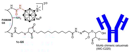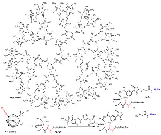 Analogous types of reactions were carried out for the grafting of epidermal growth factor [], folic acid and PEG (polyethylene glycol of variable length) [], or vascular endothelial growth factor [] to boronated PAMAM dendrimers. These dendrimers and related boronated PAMAM dendrimers bearing different types of MoAb were essentially synthesized for studying their biological properties, as will be discussed in Part 5 of this review.