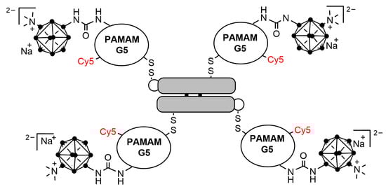 Besides dendrimers, other types of carriers of boron clusters are known, such as polymers [], nanoparticles [], or liposomes []. Polymers can be of natural origin, such as dextrans or glucose polymers, but the structure of polymers is less well defined than that of dendrimers, and their functional groups are less easily accessible. Nanoparticles are frequently composed of toxic metals or of polymer balls, whereas liposomes are quite large compared to the size of dendrimers, but several types of liposomes for drug delivery have been approved by the U.S. Food and Drug Administration (FDA) and European Medicines Agency (EMA) []. It should be noted that different types of dendrimers have been and are used in different clinical trials [], but not in the case of boronated dendrimers until now. In the view of state-of-the-art for the delivery of boron clusters, dendrimers appear to have a large potential, but that needs to be further developed.