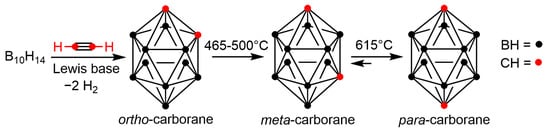 Boron clusters display a wide range of structures and intriguing properties. They have been used as materials, but also as antiseptic, antiviral, antitumor, and antifungal agents []. Carboranes (closo-dicarbadodecaboranes, also named carbaboranes) are a special class of boron clusters composed of two CR groups (R = mainly H) included in a B10H10 cluster []. The very first papers in the field of carboranes were published in 1963 [,]. They displayed the synthesis of ortho-carborane, by reaction of B10H14 with acetylene, in the presence of a Lewis base. Other isomers of B10C2H12 can be obtained by thermal rearrangement of the ortho isomer in an autoclave under inert conditions. The meta isomer is irreversibly obtained upon heating to 465–500 °C [], whereas the para isomer is obtained at temperatures above 615 °C, but this latter reaction is reversible [] (Scheme 1).
