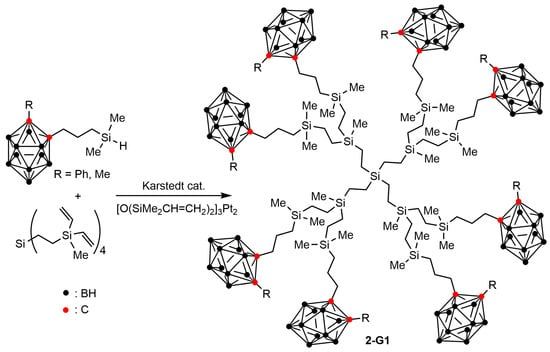 Contrarily to PAMAM dendrimers, which have been functionalized stochastically with boron clusters, carbosilane dendrimers have been functionalized on all their terminal functions with only ortho-carboranes. Different types of reactions have been used. In a first example, the carborane was first functionalized with a methyl or phenyl group on one carbon atom, and then with an alkyl-SiH function, which adds to the vinyl groups of carbosilane dendrimers, using the Karstedt catalyst (platinum derivative of divinyl disiloxane). The first generation 2-G1 was isolated in about 60% yield (Scheme 4) [].