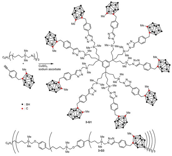 Larger boronated carbosilane dendrimers were synthesized by Copper(I)-catalyzed Huisgen-type azide-alkyne click cycloaddition reactions (CuAAC). The carborane was functionalized with a methyl group and an ethynyl group. The carbosilane dendrimers, from generation 0 to generation 3, were functionalized with azides as terminal functions. The CuAAC reaction afforded the expected dendrimers 3-G1 (nine carboranes) to 3-G3 (eighty-one carboranes) in about 80% yield. Scheme 5 displays the full structure of the first generation, and the linear structure with parentheses after each branching point for the third generation. Attempts to synthesize higher-generation dendrimers yielded insoluble materials. These dendrimers are particularly thermally stable, with only 10% mass loss at temperatures up to 392 °C for dendrimer 3-G3. Low intensity emissions were observed between 280 and 480 nm with these carborane dendrimers [].