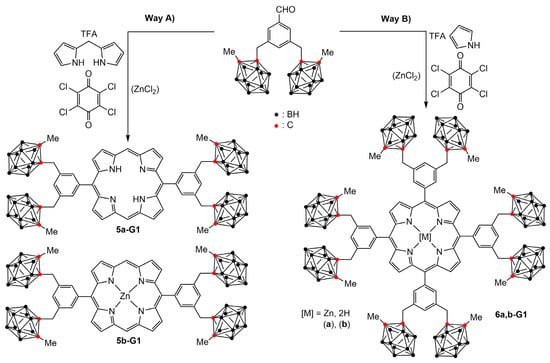 A series of different carborane dendrimers bearing a porphyrin as core were synthesized as shown in Scheme 7. In these cases, a kind of divergent synthetic process was used as two carboranes were first linked to a benzaldehyde derivative. This was then used in condensation reactions with dipyrromethene in the presence of trifluoroacetic acid (TFA), to afford the porphyrin 5a-G1 functionalized with four carboranes, in 34% yield. Addition of ZnCl2 afforded the corresponding zinc complex 5b-G1 (Scheme 7, way A). Both the free porphyrin and the complex are insoluble in water, but they can be easily converted into the corresponding water-soluble nido-carboranylporphyrins by base degradation with pyridine/piperidine, followed by cation exchange with a Dowex resin []. An analogous process was applied to pyrrole instead of dipyrromethene, affording the porphyrin 6a-G1 functionalized with eight carboranes, isolated in 15% yield (Scheme 7, way B). The complexation of zinc (compound 6b-G1) and the degradation to obtain water-soluble nido-carborane derivatives was carried out with compounds 6a,b-G1, as was carried out for compound 5-G1 [].