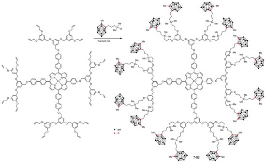 Another series of porphyrin-cored carborane dendrimers was synthesized in a different way, by grafting the carboranes to the surface of porphyrin dendrimers. Generations 0 (four carboranes), 1 (eight carboranes), 2 (sixteen carboranes), and 3 (thirty-two carboranes) were synthesized by a regioselective hydrosilylation reaction on the allyl functions of the dendrimers, with carboranylsilanes in the presence of the Karstedt catalyst, as illustrated for generation 2 (7-G2) in Scheme 8. All the carboranyl−carbosilane dendrimers were isolated in good to excellent yields in the range of 60–88%. Studying the photoluminescence properties revealed that the photoluminescence characteristics of the porphyrin core are unaffected by the presence of carboranes [].