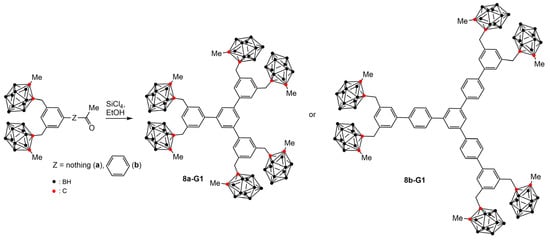 As in the case of the porphyrin core, boronated dendrimers having a phenylene core were synthesized by a convergent method or by a divergent process. In the first method, a trimerization reaction of arylketones bearing two carborane units mediated by silicon tetrachloride afforded the first generation dendrimers 8a,b-G1 in 55% (a) and 40% (b) yield, respectively (Scheme 9). In order to have water-soluble compounds, alcoholic NaOH was used to induce the removal of one of the vertex boron atoms to yield a monoanionic nido-carborane [].