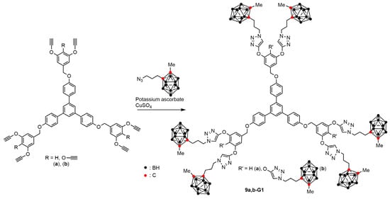 Another family of boronated dendrimers was obtained by CuAAC reactions between a dendrimer having six or nine alkyne functions and a carborane functionalized with an azide. Dendrimer 9a-G1 bearing six carborane units was isolated in 78% yield, whereas dendrimer 9b-G1 bearing nine carborane units was isolated in 76% yield (Scheme 10) [].