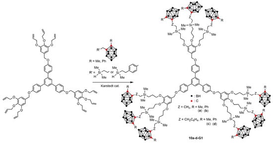 Four different carborane dendrimers (10a-d-G1) were obtained by hydrosilylation reactions between carboranes functionalized with a silane, and a dendrimer bearing nine allyl groups. They were isolated with yields in the range of 60–85% (Scheme 11). The removal of one boron vertex from each cluster leads to water-soluble macromolecules. Photoluminescent properties with high quantum yields, but depending on the nature of the clusters, were observed [].