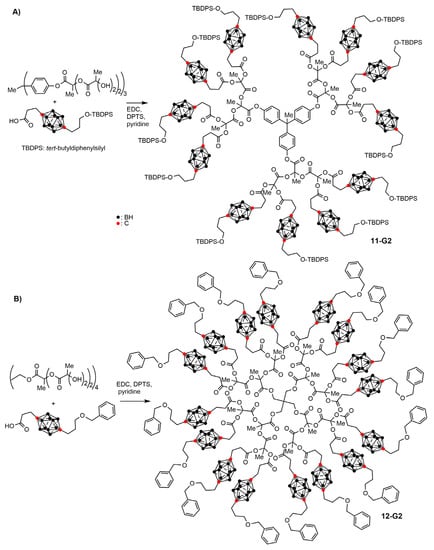 Different other types of carborane dendrimers were built from aliphatic polyester dendrimers, grown from 1,1,1-tris(hydroxyphenyl) ethane (Scheme 12A) or pentaerythritol (Scheme 12B) as core in the presence of EDC (1-[3-(dimethylamino)propyl]-3-ethylcarbodiimide) and DPTS (4-(dimethylamino)pyridinium-p-toluene sulfonate) as coupling agents. The dendrimers were isolated with yields ranging from 79 to 93%. Contrarily to all the previous cases which used ortho-carboranes, para-carboranes were used in these cases. The presence of TBDPS (tert-butyldiphenylsilyl) (11-G2) or benzyl ether (12-G2) as terminal functions enables the growth of new polyester branches as will be shown in Part 3.2. [].