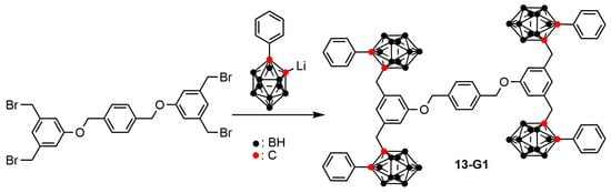 A small carborane dendrimer (13-G1) was obtained from an arylether dendrimer and isolated in 82% yield (Scheme 13). As already indicated for other types of carborane dendrimers, water-soluble compounds were obtained by degrading the closo-cluster to the nido-cluster under basic conditions using KOH in EtOH. All these closo- and nido-carborane dendrimers show strong fluorescence emission in different solvents [].