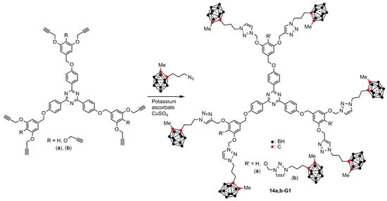 A series of triazine-cored small dendritic molecules containing three (not shown), six (14a-G1), or nine (14b-G1) peripheral carborane clusters were synthesized through CuAAC reactions and isolated in 75%, 71%, and 66% yield, respectively (Scheme 14). Thermal analyses demonstrated that dendrimers 14a-G1 and 14b-G1 maintained 53 and 54 wt% of residue at 700 °C, respectively [].