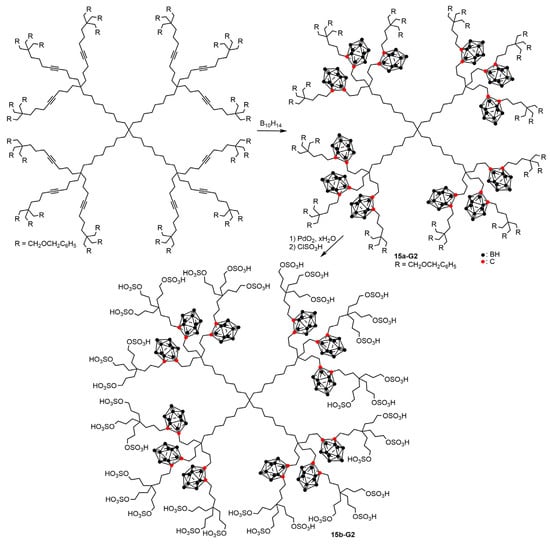 Hydrocarbon dendrimers equipped with an internal layer of alkyne moieties were reacted with decaborane to afford different 1,2-dicarba-closo-dodecaboranes (Scheme 15), using the method shown in Scheme 1. This process was carried out with both, the first (four carboranes) and the second generation 15a-G2, having twelve carboranes inside its structure, and being isolated in 77% yield. The terminal benzyl ether moieties were converted to peripheral alcohols, which were subsequently transformed to sulfate groups, to afford the water-soluble carborane dendrimer 15b-G2 []. The alcohol terminal groups were also converted to carboxylic acids [].