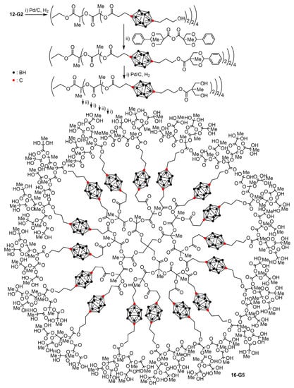 Dendrimer 12-G2 (Scheme 12) possesses benzyl ether terminal functions, which were cleaved with Pd/C in the presence of H2, to obtain alcohol terminal functions, suitable for further divergent growth. Reaction with 2,2-bis(hydroxymethyl)propanoic acid (bis-MPA) was followed by deprotection with Pd/C in the presence of H2, to yield alcohol terminal functions. Repetition of both steps resulted in the growth of the dendritic branches, up to the fifth generation 16-G5 (Scheme 16) []. Analogous smaller dendrimers bearing four carboranes (G2) and eight carboranes (G4) were studied together with 16-G5 to determine their thermally-induced phase transition in aqueous media [].