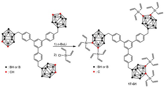 A small carborane dendrimer was first obtained by a cyclotrimerization reaction, analogous to the one shown in Scheme 9, and was then functionalized with trivinylsilane, to afford the phenylene-cored dendrimer 17-G1, as shown in Scheme 17. This compound was isolated in 61% yield, and could be a precursor for the synthesis of larger carbosilane dendrimers [].