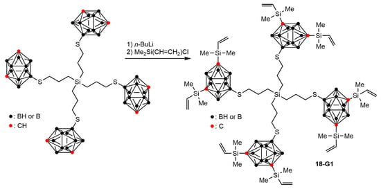 Another carbosilane dendrimer bearing four meta-carboranes linked through a B–S bond was functionalized with chloro(dimethyl) vinylsilane to afford the first generation dendrimer 18-G1, isolated in 90% yield (Scheme 18) [].