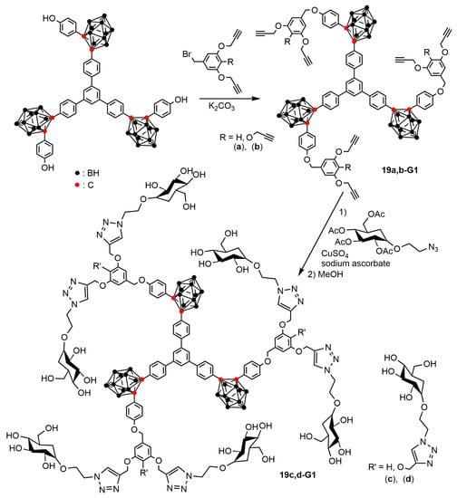 A recent paper displays the grafting of two or three alkynes per carborane on a phenylene-cored dendrimer to obtain dendrimers 19a-G1 and 19b-G1, respectively. Dendrimers 19a,b-G1 were subsequently used in CuAAC reactions with a protected glucosyl azide, isolated in 55–60% yield. Deprotection in the last step afforded the glycodendrimers functionalized with three internal carboranes and six (19c-G1) or nine (19d-G1) glucose derivatives on the surface, isolated in 73–80% yield (Scheme 19) [].