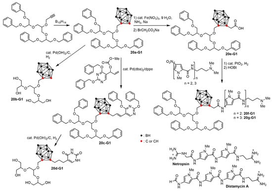 In a second attempt, netropsin and distamycin A analogues were grafted to the carboxylic acid dendron 20e-G1, obtained by coupling the CH of the carborane of dendron 20a-G1 with BrCH2CO2Na. Netropsin and distamycin A (structure in Scheme 20) are natural products, possessing two or three methylpyrrole moieties, respectively. Both compounds are able to bind to the minor groove of double helical DNA. Their analogues were grafted first by reduction of the nitro group to the corresponding amine, followed by condensation with dendron 20e-G1, using HOBt (hydroxybenzotriazole) and DCC (N,N′-dicyclohexylcarbodiimide) to give the desired products 20f-G1 and 20g-G1 both isolated in 65% yield (Scheme 20) [].